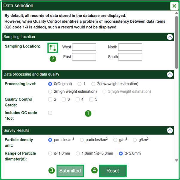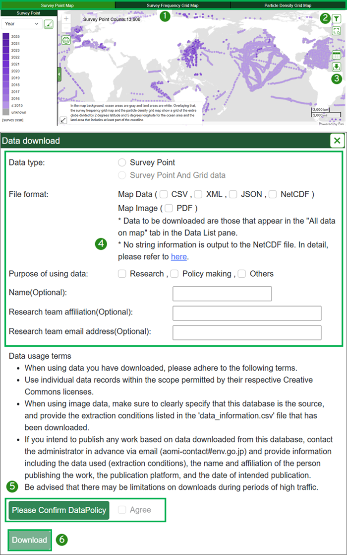 - A map will open that shows the survey frequency of microplastic waste for each grid (2 degrees latitude by 5 degrees longitude). Areas with higher survey frequencies per unit area will appear darker.